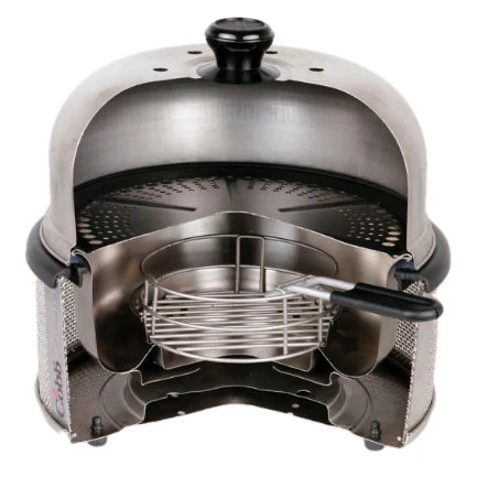 Dome: made from stainless steel with a heat-resistant handle. The holes ensure even ventilation throughout the cooking process, creating an oven-like effect.